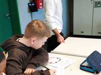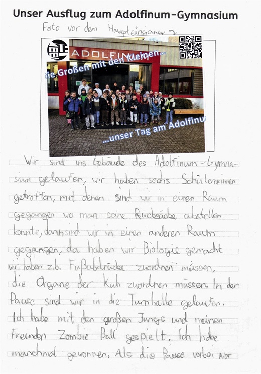 Zum Ende des ersten Halbjahres waren unsere dritten Klassen ins Adolfinum eingeladen, um dort einen Projekttag unter dem Motto "Die Großen mit den Kleinen" zu erleben. Dabei führten die "Großen" aus dem 11. Jahrgang unsere "Kleinen" den ganzen Vormittag durch die Naturwissenschaften und sorgten für spannende Experimente und erstaunliche Erkenntnisse in den Fächern Biologie, Chemie und Physik. So konnten die "Großen" in den Beruf des Lehrers hineinschnuppern und die "Kleinen" die Arbeitsweisen am Adolfinum kennenlernen, eine wirklich gelungene Kooperation.