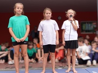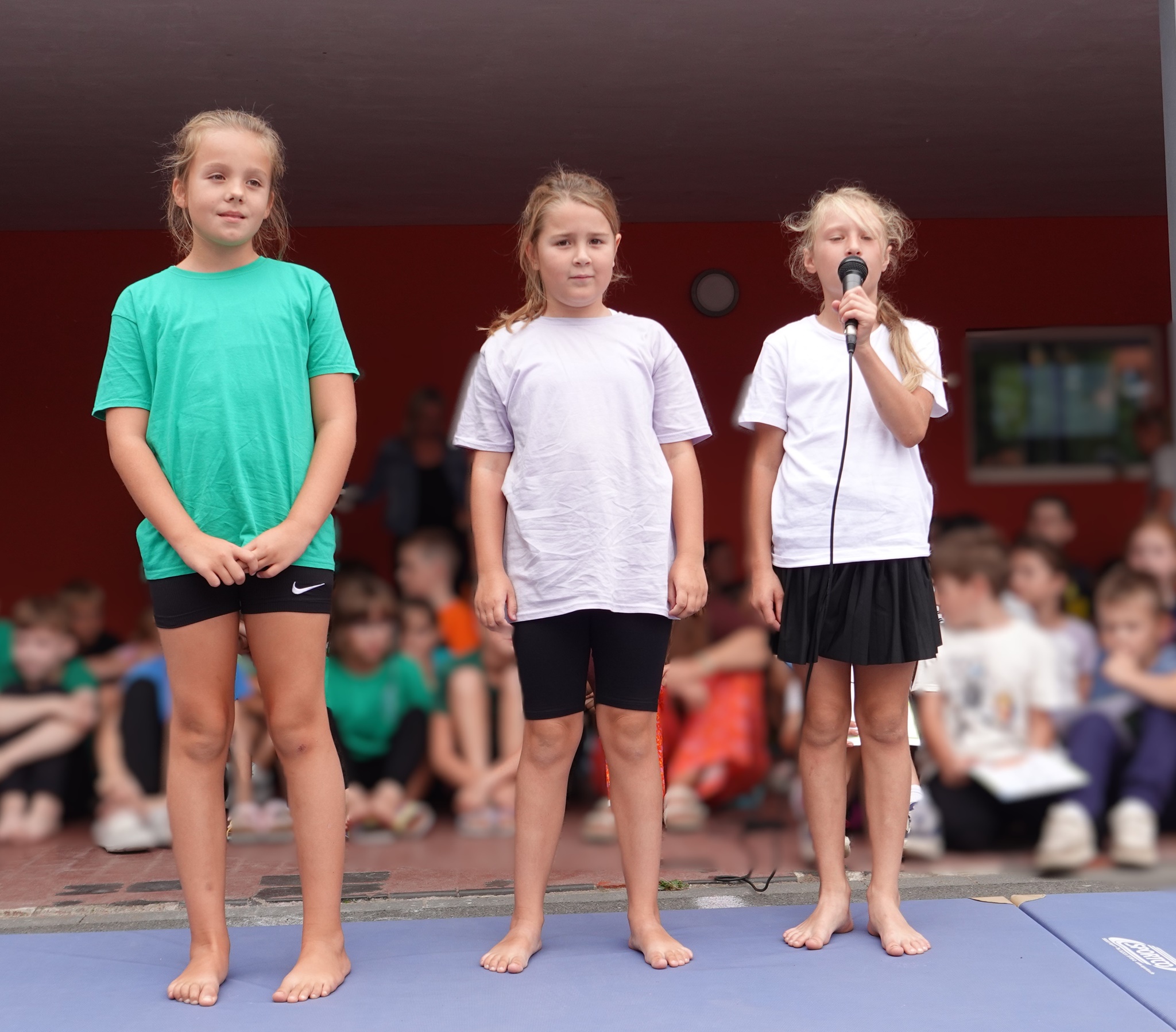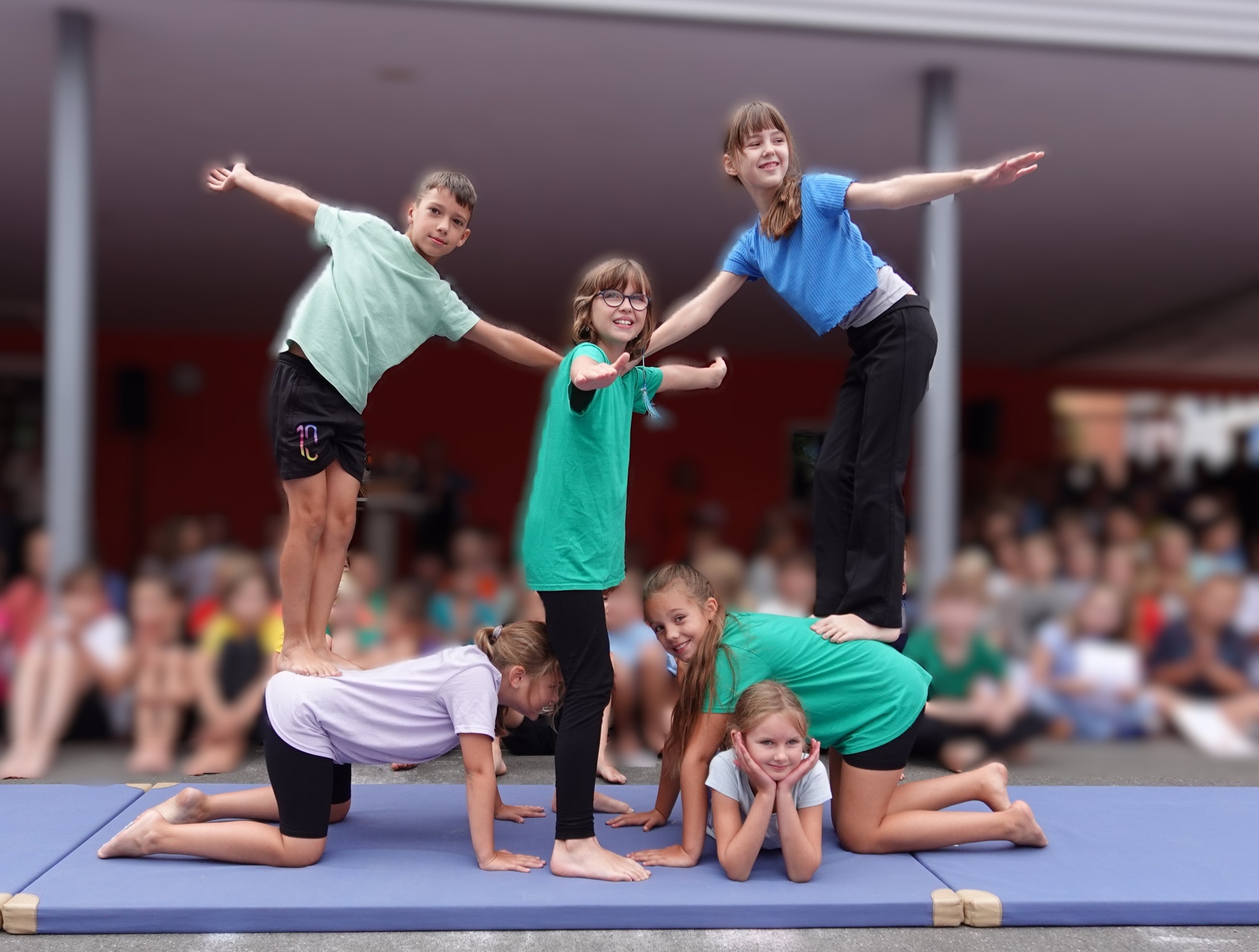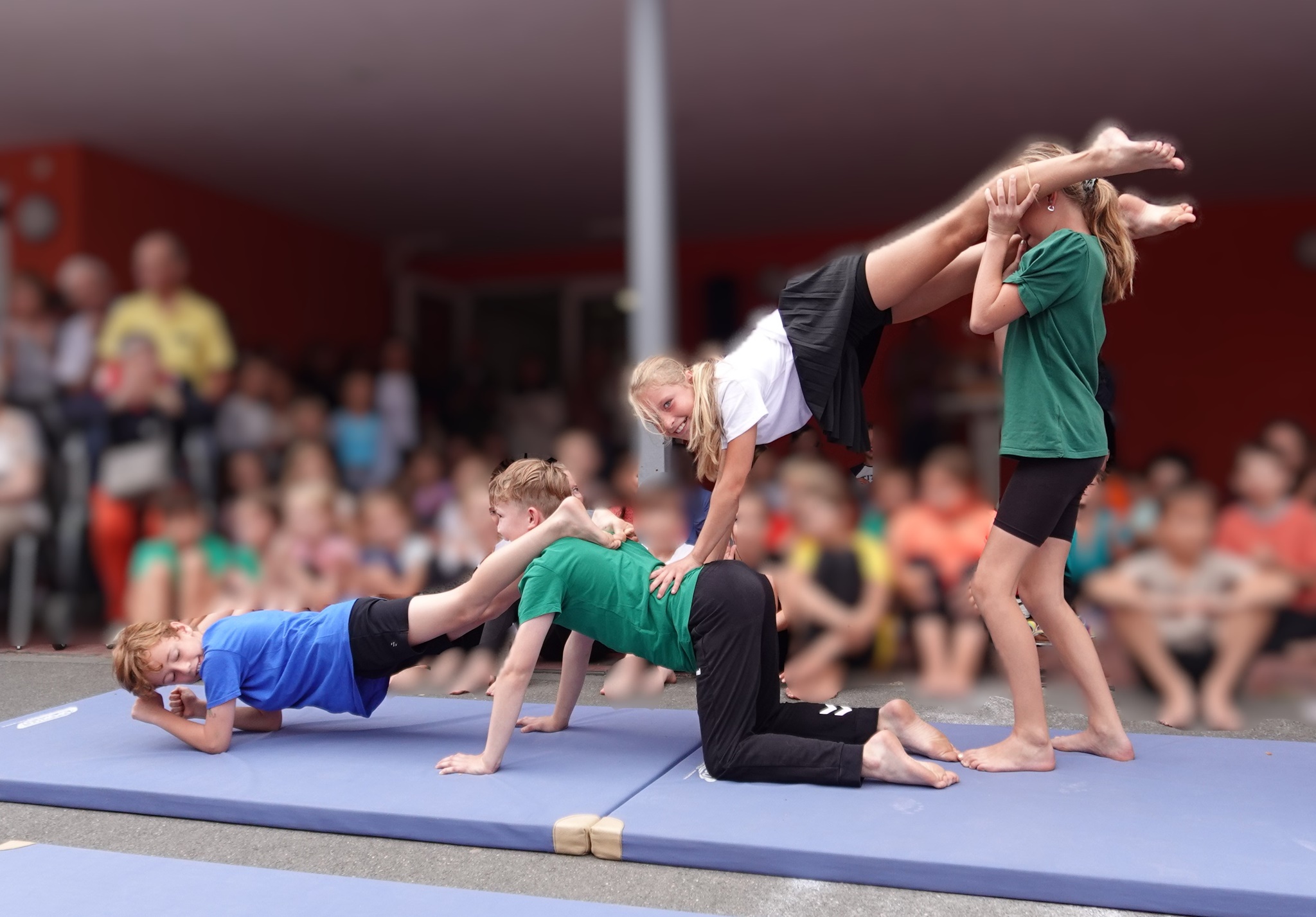 Hier in unserer Schule lernst du Schreiben, Lesen, Rechnen. Das ist richtig. Doch auch Bewegung ist ganz wichtig! Ob Fußball, Schwimmen, Eislaufen oder Seilchen springen, gemeinsam aktiv sein, dass wird uns Freude bringen. Rollen, Räder oder Pyramiden bauen, jetzt gibt es ganz schön was zu staunen.
